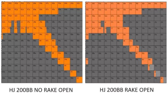 两个都是200BB深度游戏的HJ位置率先加注范围,但左边是无服务费游戏的范围,而右边是标准服务费游戏的范围。