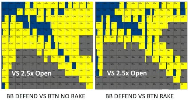 你可以从这张大盲位置防守图表上看到,范围在有服务费的游戏中缩得更紧。Solver软件在服务费很高时除去了很多最差的牌。