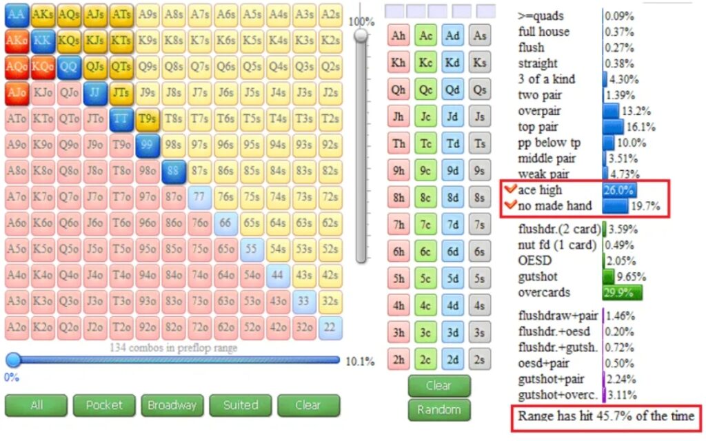 即使他的起始范围很紧,你也必须意识到,他范围里的绝大多数的牌都会错过翻牌。