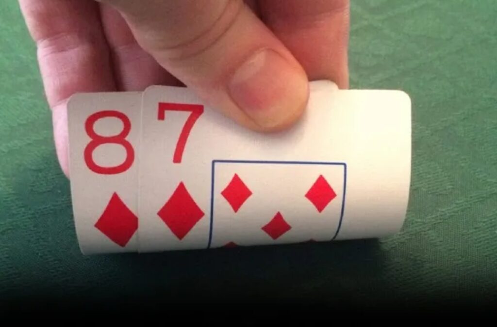 想象一下,你正在打$1/$2的常规桌。翻前,你直接用8♥7♥加注,大盲玩家跟注。