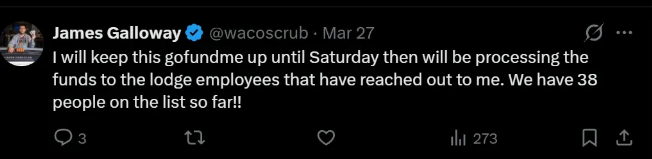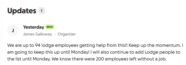 我为这次筹款捐了款,因为这件事对我来说意义重大。如果你有能力,哪怕只是一次转发或一点小小的捐款,都能帮助这些员工度过难关,并向大家证明The Lodge大家庭因团结而更强大。”