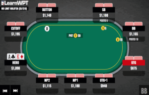 这手牌来自一个盲注5/10美元的无限德州扑克常规局。桌上玩家筹码量如图所示。 翻前, UTG+1玩家加注到3BB,后面玩家弃牌,你在劫位用A♣ K♦再加注(3-bet)到9BB,而大盲玩家再加…